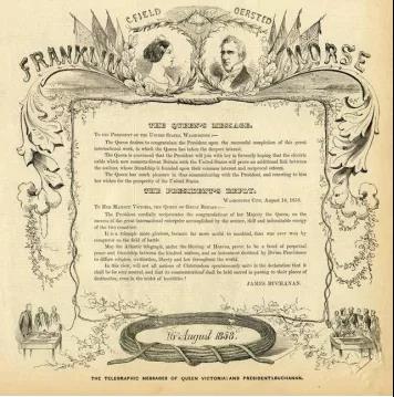 幾個小時后,世界一片歡騰,全世界的人們都在興奮的等待著這一刻。1858年8月16日,維多利亞女王發給美國總統布坎南的賀電通過海底電纜傳到北美,布坎南向英國女王回電,同時,禮炮鳴放100響,慶祝人類這一偉大的歷史時刻。
