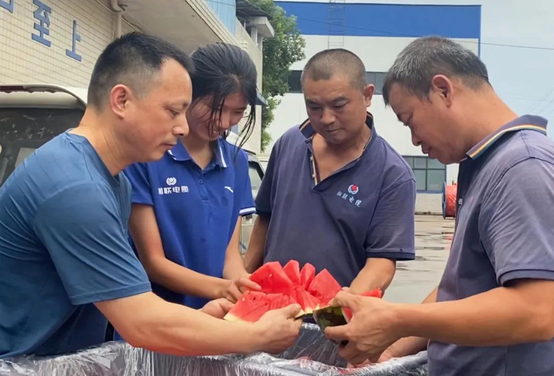 面對高溫天氣,湘聯電纜領導高度重視員工生命安全,并采取多項措施幫助員工應對高溫生產工作,如配備防暑降溫的藿香正氣水、涼茶等物品,同時堅持開展夏日送西瓜的員工福利活動,預防高溫中暑。
