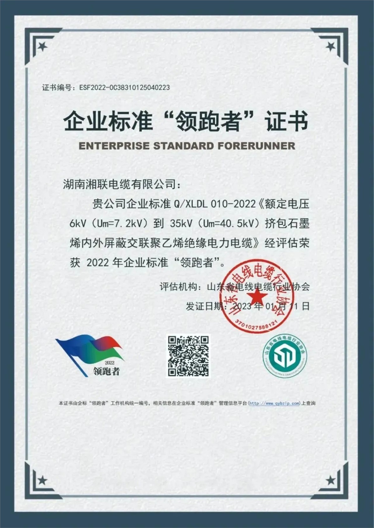 自成立以來,湘聯電纜以“質量是發展的基石,是客戶信任的唯一理由”為指導,將產品質量視為企業生命線,不斷引進國內一流的電線電纜生產和檢測設備,以科學的經營管理理念,組建實力雄厚的技術研發和企業管理團隊,建立高標準質量管理體系,對生產全過程實現智能化數字化管理,公司產品先后通過國家強制性產品認證(CCC認證),榮獲企業標準“領跑者”等榮譽稱號,獲得用戶的廣泛認可。